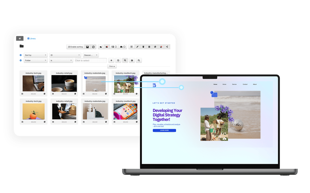 Drag and drop, or use dynamic links. Assets are published using the correct format, size, and metadata.